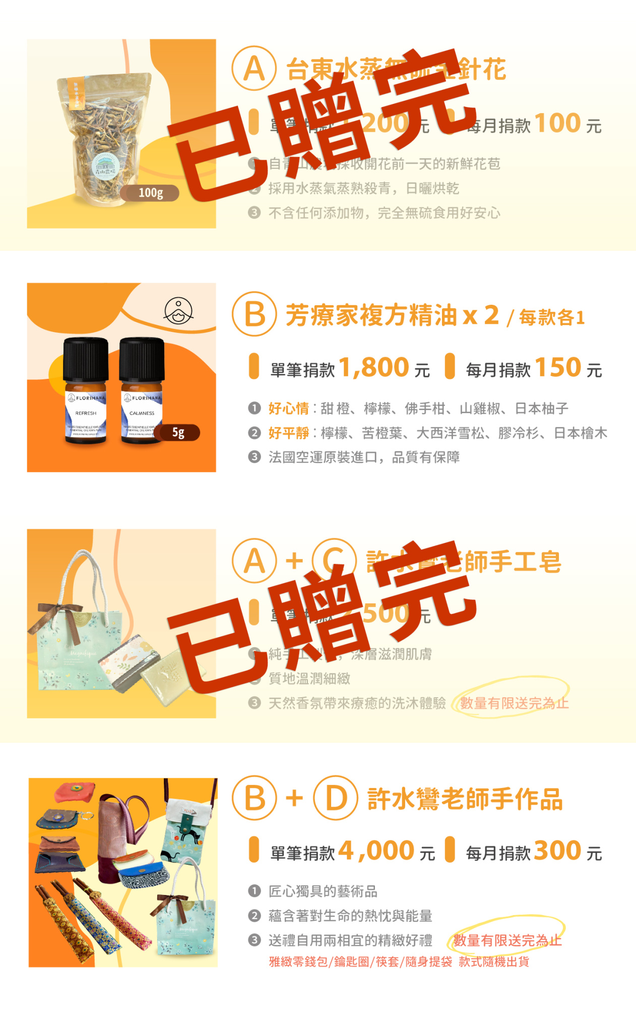 臺灣防盲基金會長年於台灣偏鄉,針對兒童及長者進行眼科檢查,以強化社區居民及學童眼睛保健觀念。邀請大家支持防盲的各項服務與計畫,捐款滿額即可回饋法國空運原裝進口芳療家複方精油5gX2瓶(好心情、好平靜各1)。善款扣除成本後,將用於2025年度臺灣防盲眼科篩檢服務,提供偏鄉居民免費眼睛檢查、配鏡矯治、衛教宣導、醫療轉診服務。