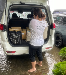 今年七月的颱風,為南部帶來豪雨造成不少災情,這次防盲義診團隊在前一日抵達高雄萬山部落場佈時,下午突然風雲變色,晚餐結束返回民宿休息遇到大雷雨,每個人的手機都陸續收到土石流警報,志工驗光師的車輛甚至因為壓到落石而爆胎,團隊回到民宿後緊急召開會議,擔心隔日長輩前來義診途中的安危,討論評估是否要取消。每個人時時刻刻盯著手機不敢鬆懈,確認天氣狀況、有沒有宣布停班停課,為可能的突發狀況做好萬全的準備。