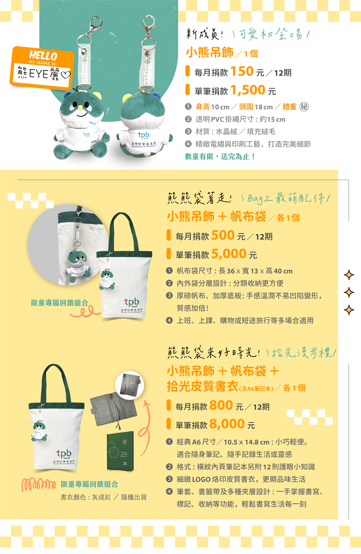 含「熊EYE麗」小熊吊飾 + 限定logo帆布袋 + 拾光皮質書衣(含A6筆記本) 各1個