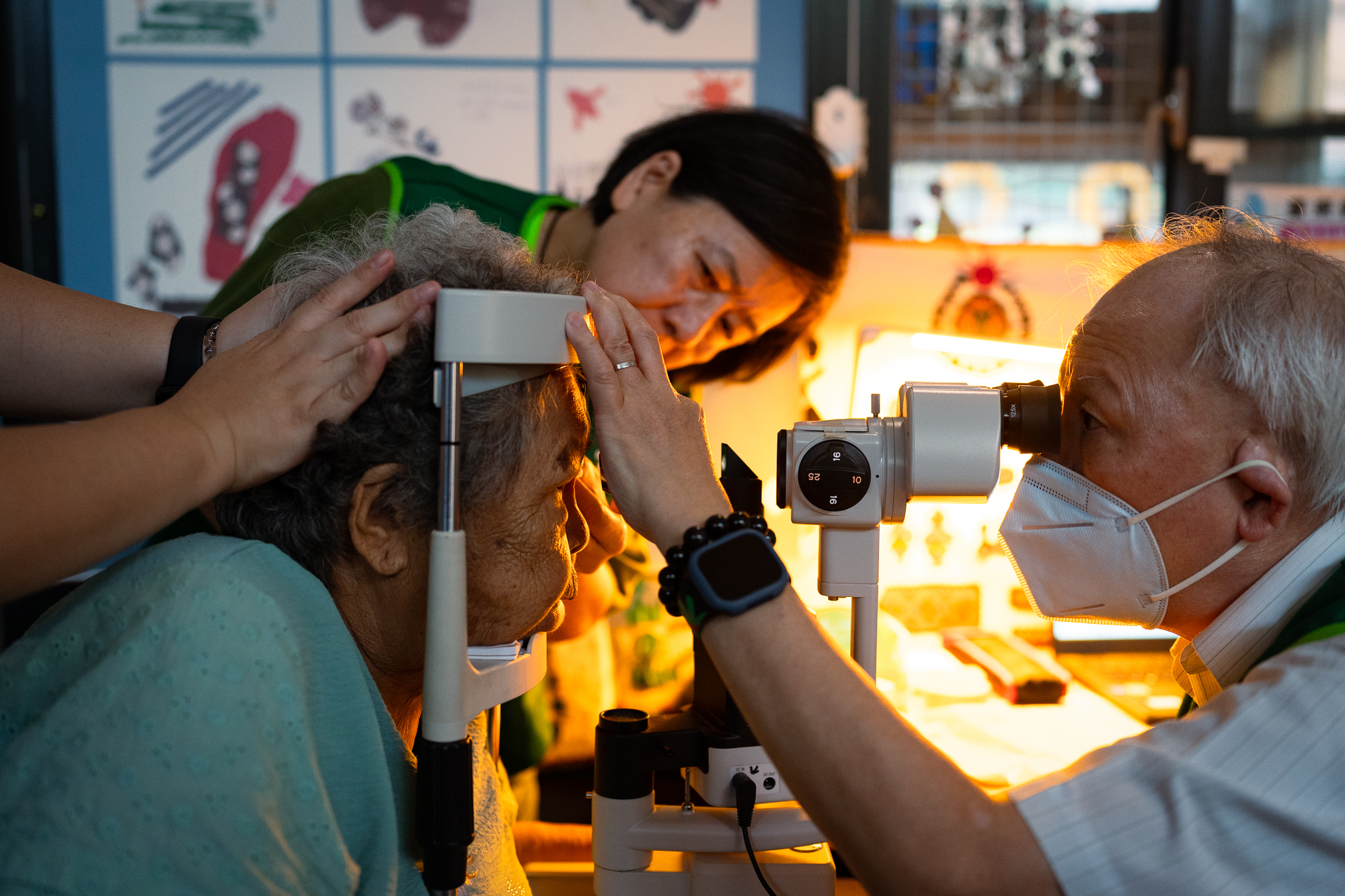 在義診等候區,長輩們一邊等待,一邊專注於手上的編織工藝——是與他們歲月相伴的日常,卻也耗損著眼力。因缺乏醫療管道與預防知識,長輩們習慣忍耐不適,又或因語言、文化上的隔閡,往往拖到眼疾惡化才求醫。孩子們則因長時間使用3C,近視年齢不斷下降。長久以來,交通與經濟的雙重壓力,讓這些偏鄉居民們的視力健康被迫延宕。