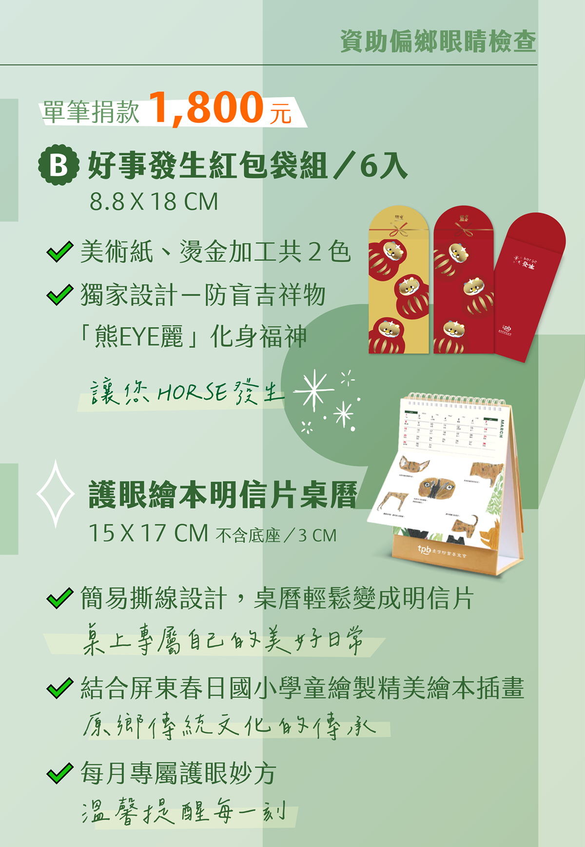 獨家設計,傳遞年節喜悅的「好事發生」紅包袋組,以及獨一無二的護眼繪本明信片桌曆,精美插畫來自屏東春日國小學童所描繪的家鄉故事,結合每月實用護眼知識,連結了偏鄉文化美學與光明視野——讓感謝不僅是傳遞祝福,更成為傳承原鄉文化之美的同行力量。