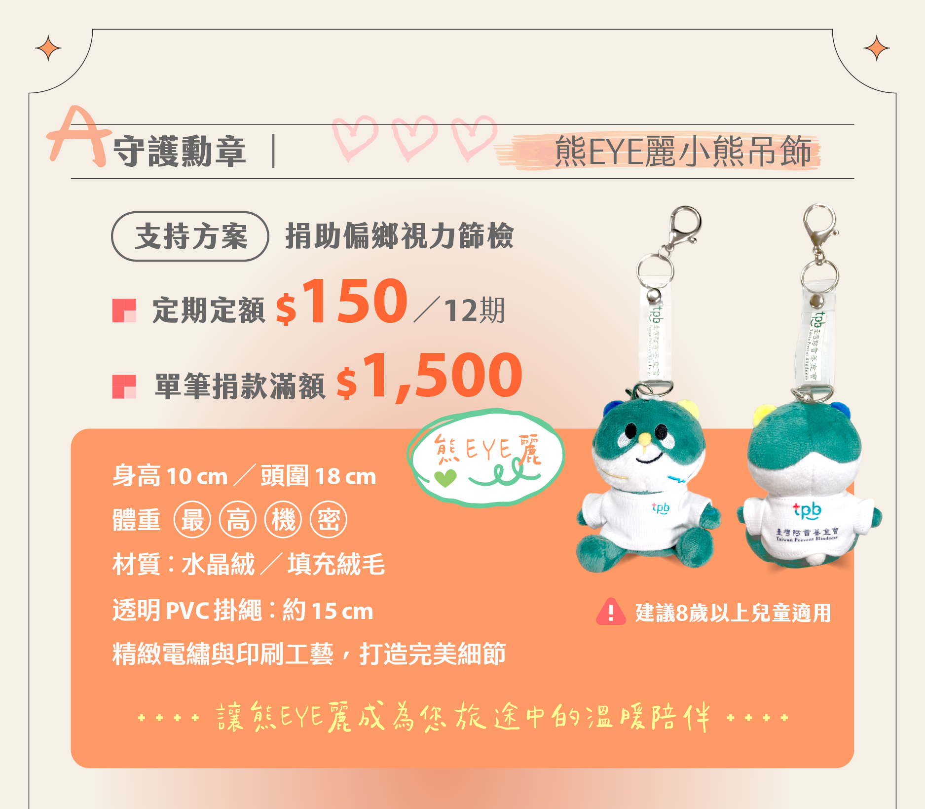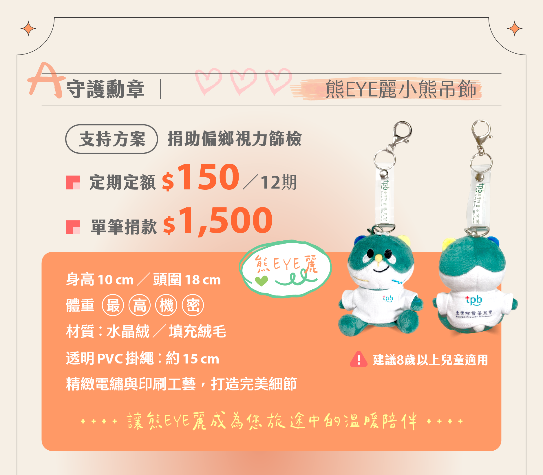 定期定額每月 150 元,訂閱一份美好承諾,和「熊EYE麗」一起成為偏鄉孩童的視力神隊友 !