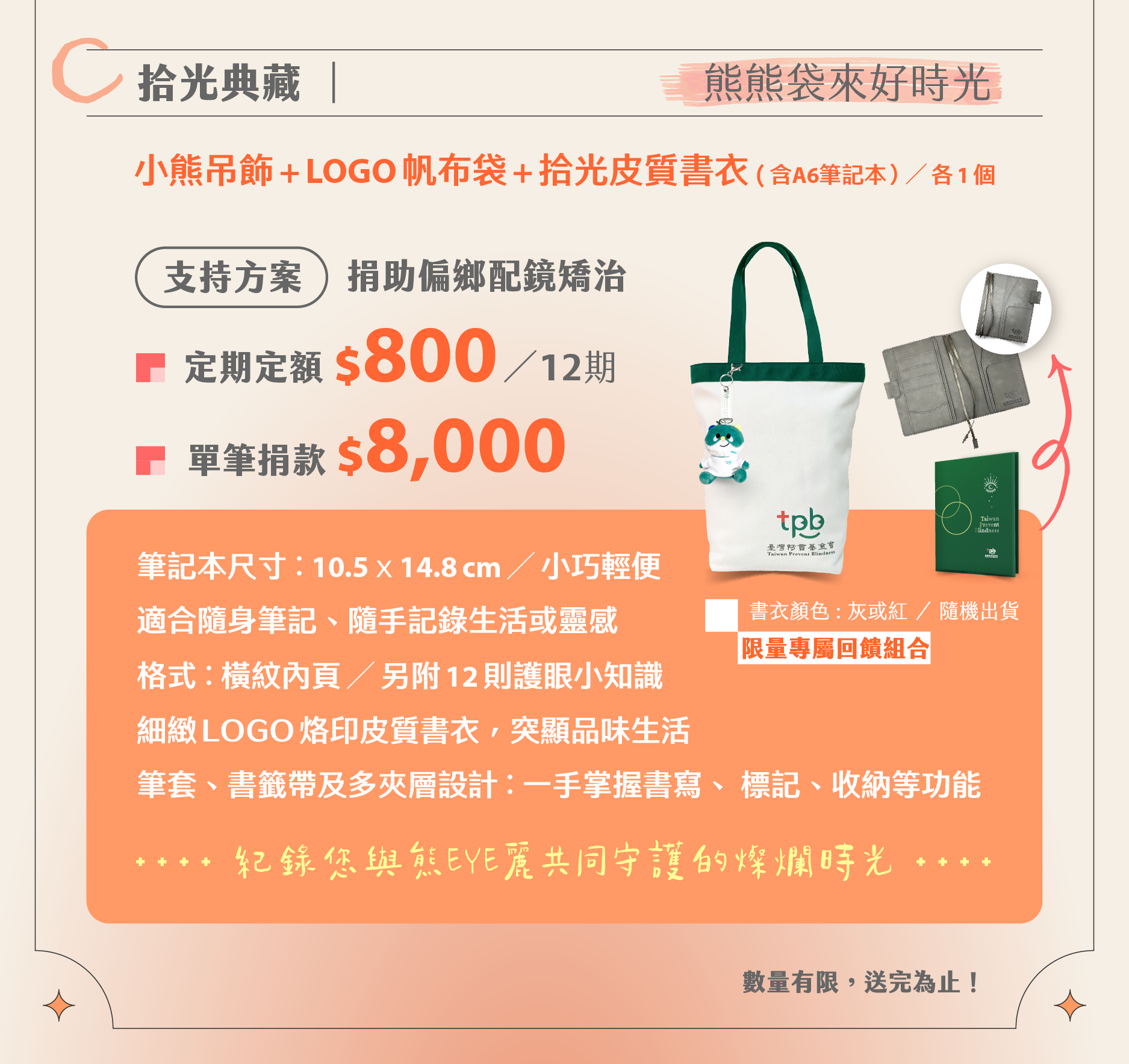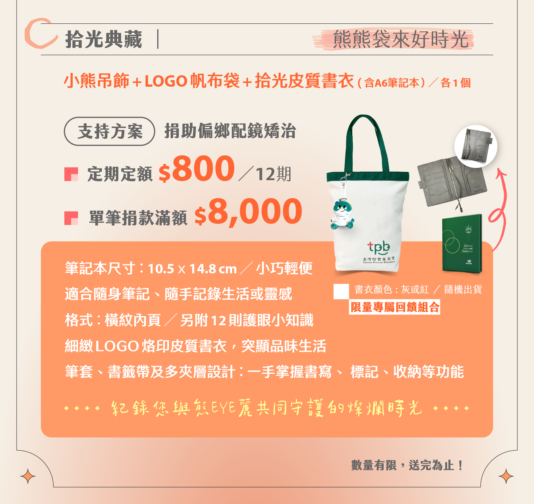 專屬回饋:「熊熊袋來好時光」限量組合(含小熊吊飾 + Logo 帆布袋 + 拾光皮質書衣/內含 A6 筆記本 / 各 1 個)