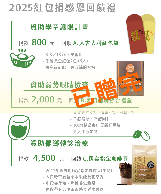捐款回饋大吉大利紅包組、濾掛咖啡綜合禮盒(已贈完)、國宴咖啡豆